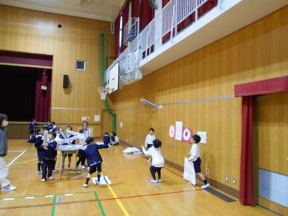 2年生の作った動くおもちゃで、1年生と一緒に楽しくあそびました。