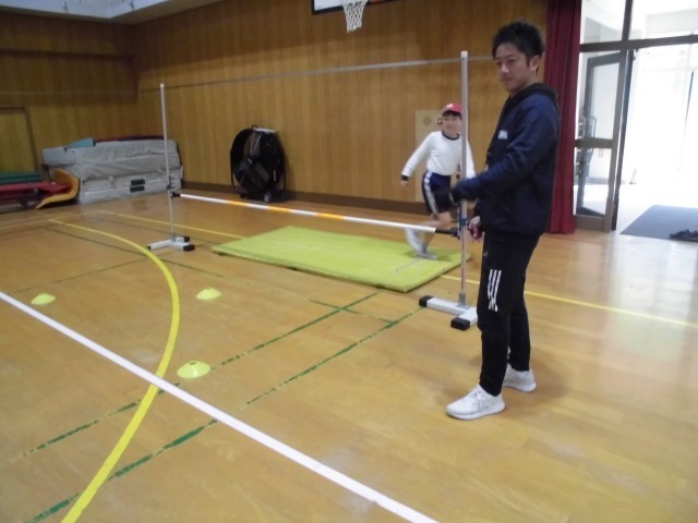 入念なストレッチのあと、講師の先生から走り高跳びのコツ(助走とリズム、ふみきり足をまちがえないようにすること)を教えてもらいました。