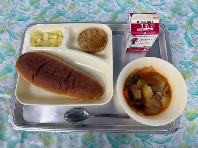 1年間で最後の給食は、「チキンレバーカツ」「ケチャップ煮」「キャベツのサラダ」「黒糖パン」「牛乳」でした。