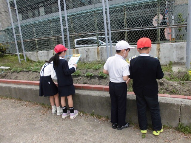 「だんごむし」「ぎざぎざのはっぱ」「黄色い花」など、運動場で探しました。