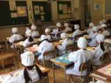 初めての給食、白衣を着て、みんなで協力して給食を用意しました。 6年生のお兄さ...