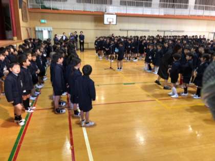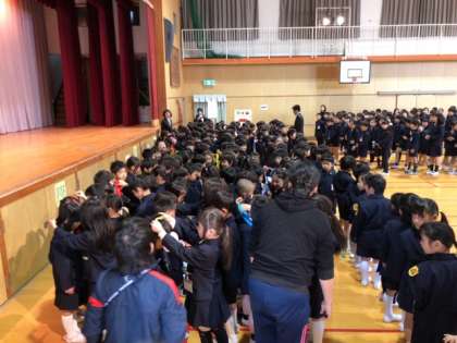 5日に入学してきた新入生と2〜6年生が初対面です。6年生が在校生を代表して歓迎の言葉を贈り、2年生がメッセージを書いたハートのメダルを贈りました。新たな仲間を歓迎します!