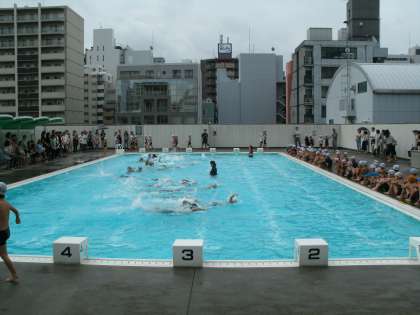 昨日からのぐずついた空模様で実施が心配されましたが、開始時間を待ちわびる大勢の保護者の願いが通じたのか、プールのある屋上に上がると同時に、雲間から陽が差し始めました。