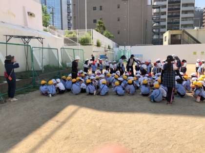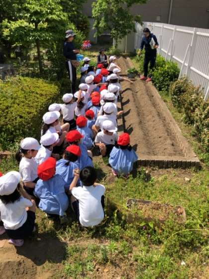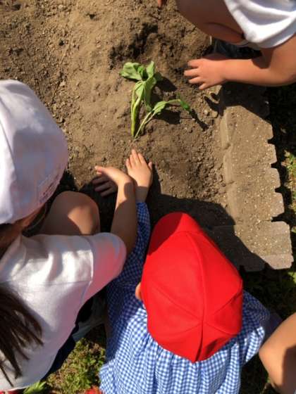 幼稚園のばら組さんきく組さんと一緒にサツマイモの苗植えをしました。たくさんおいもができるといいですね!