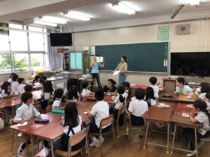 今年も大阪外国語専門学校のみなさんに1,2年生の英語活動をしていただきます。元気な声で自己紹介やゲームに取り組めました。