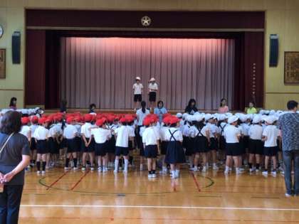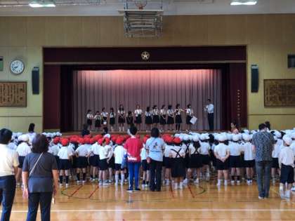 今日は児童朝会でキックベース大会の表彰がありました。運動環境の制限が厳しいなかで、すごいですね。また、代表委員からあいさつ週間の呼びかけもしてもらいました。