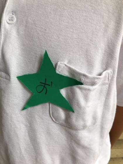 今週はあいさつ週間です。代表委員のメンバーが朝正門のところで元気にあいさつしています。胸の星には文字が一つ。日替わりで一週間で一つの言葉になります。