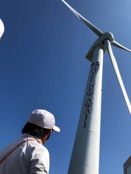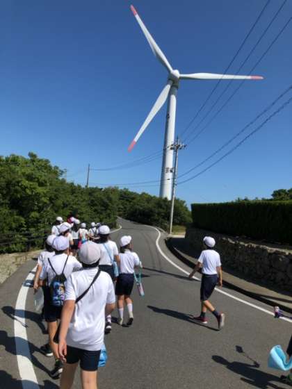 ハイキングのゴールは、宿舎からも見えた風力発電の風車です。間近に行くと、とてつもない大きさでした。なんと羽根一枚の長さは、35m!近くをトンビが飛んでいました。トンビの歌は音楽で習ったけど、本物の鳴き声は初めてでした。