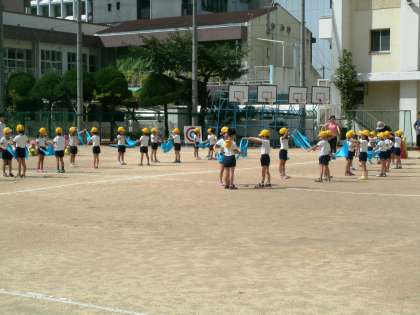 本校の運動会は中大江幼稚園と合同で行います。小学生の練習時間の合間を縫って、今日の2時間目、幼稚園児たちが先生方に手を引かれて小学校の運動場にやってきました。初めて演技する場所をきょろきょろと目で確認しながら、お遊戯の練習に頑張っていました。