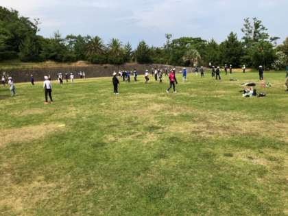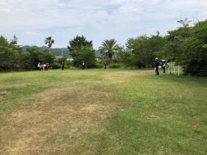 ディスクゴルフ始まりました。説明を聞いたあと、広場で練習して、コースを回りました。なかなか上手です。