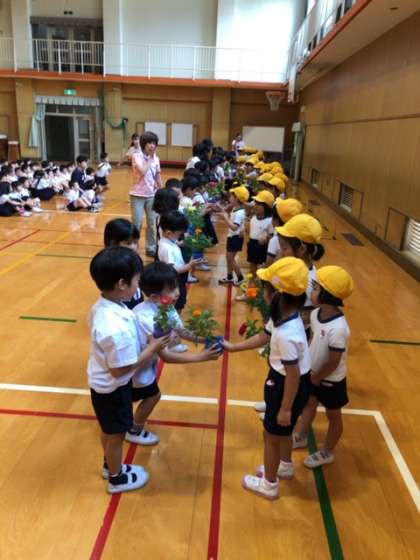 幼稚園生が種から大切に育て、きれいに咲かせた花を小学校にも分けてくれました。大切にするからね!