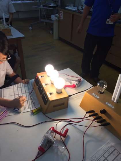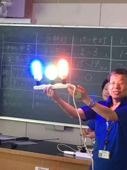 手回し発電機を使って、蛍光灯やLED電球などの消費電力の違いを体感する授業を受けました。