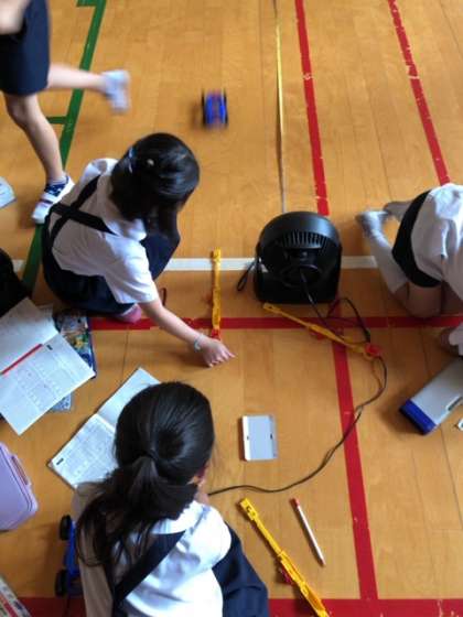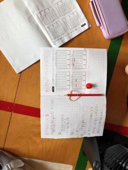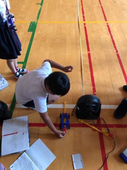 ゴムの伸びの長さと車が進む距離の関係を調べています。実験を楽しむだけでなく、ノートに記録をまとめ、考えることができました。