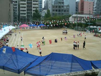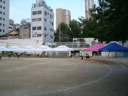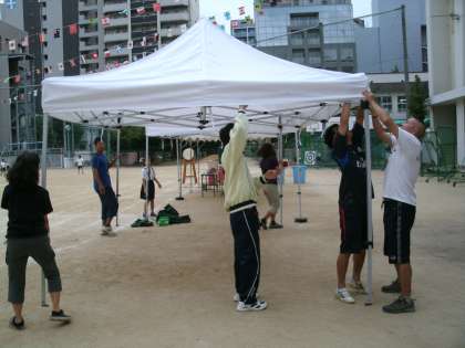 児童席は、これまでは当日の早朝、大勢のお父さん方に手伝っていただきながら地域から借用したテントを組み立てていました。ところが昨年、140周年記念事業委員会からワンタッチテント5張を寄贈していただいたお陰で、今年は職員のみで短時間で組み立てることができ、児童席全体に日よけが確保できました。