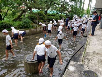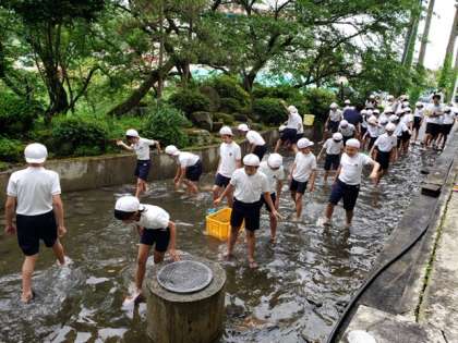 魚つかみをしています。網も使わず手で捕まえます。山水は冷たくて気持ちいいです。