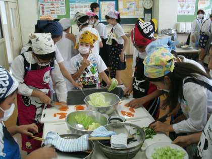 今日は6年生の家庭科の調理実習がありました。メニューは「三色野菜の油いため」です。キャベツやニンジンやピーマンなどの色と栄養のバランスとを考えた野菜を使っての調理でした。