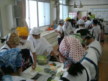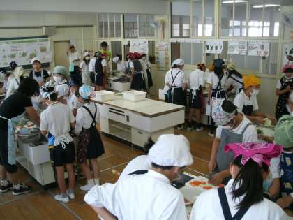 家庭科室では、男女仲良く協力して仕事の分担を決め、楽しく調理に取り組んでいました。男子が女子からの注意を受けながら上手に包丁を使っている姿がほほえましかったです。