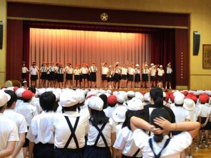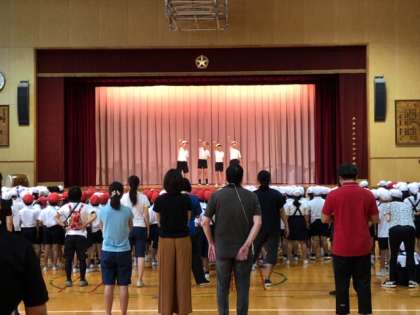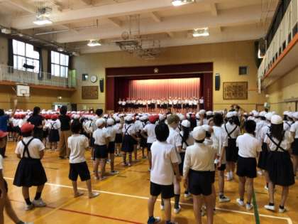 児童集会では応援団員の紹介のあと、運動会の歌の練習がありました。応援団の元気さに引っ張ってもらい、みんなの元気な声が響きわたりました。