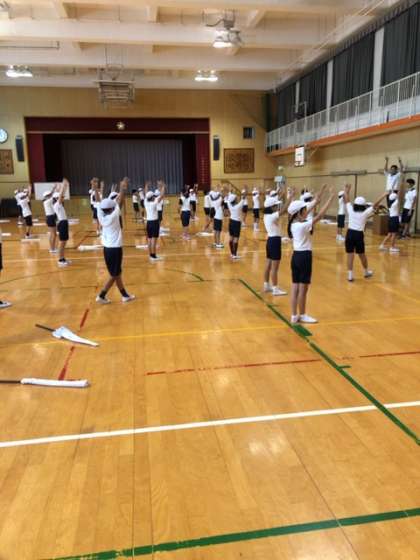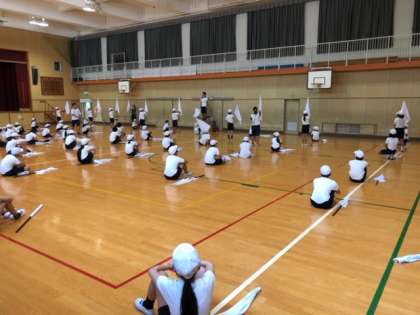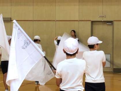 運動会の演技練習です。先輩たちが使ってきたフラッグを受け継ぎました。真っ白なフラッグには、それを使っていた先輩から、後輩へのメッセージがかかれています。