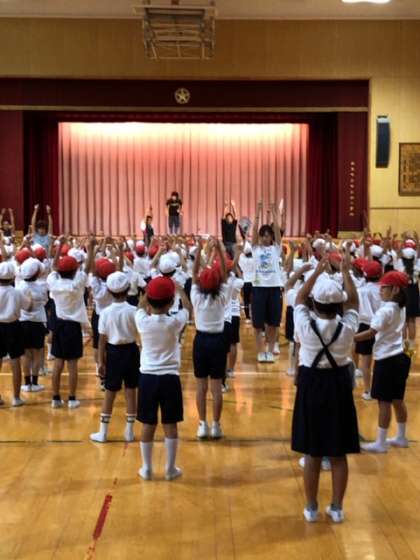 123年生がラジオ体操の練習をしています。きっちりやるのはなかなか難しそうです。