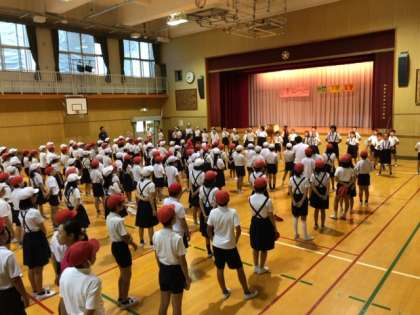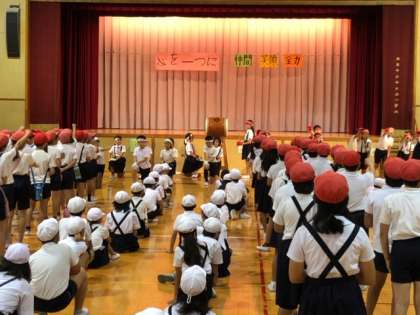 今日の集会は応援合戦の練習です。応援団の元気な声に運動会の機運が高まってきました。
