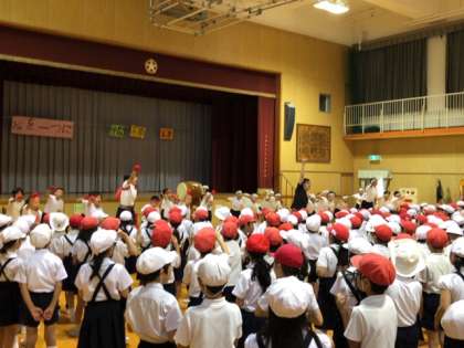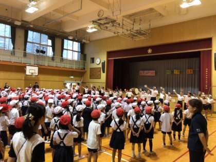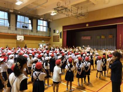 今日は低学年の応援合戦の練習です。応援団の元気さに負けないくらい、元気いっぱいの声が響きわたりました。