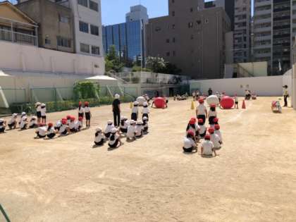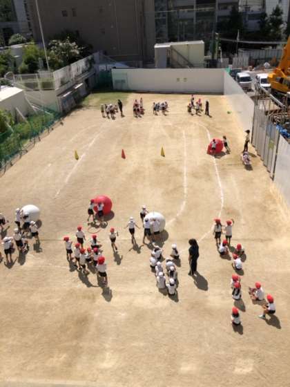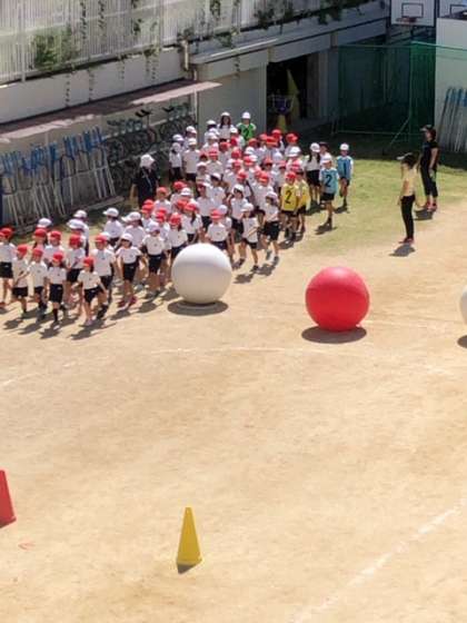 運動会で行う大玉ころがしの練習です。大玉の感触を楽しみ、友だちの応援も元気にしています。