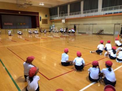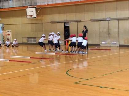 運動会の団体競技、棒引きの練習をしています。応援にも熱が入ります。