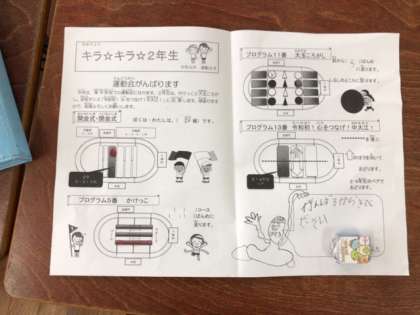 運動会に向けて、保護者の方々へ子どもがメッセージを書いています。ザリガニも元気です。