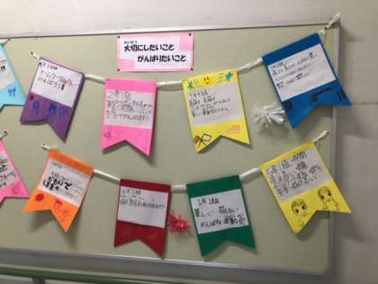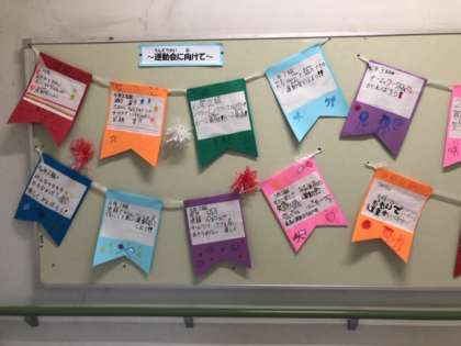 給食室から上がった所に、各クラスでたてた、運動会のめあてが掲示されています。