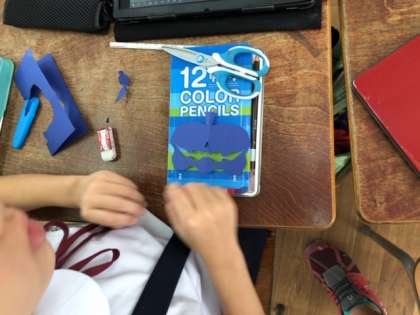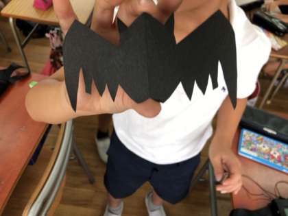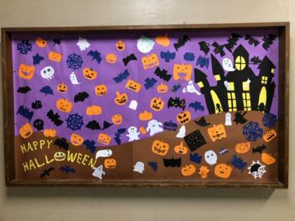 10月の玄関掲示を全員で作っています。みんなで作った作品が玄関に飾られました。