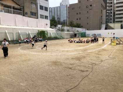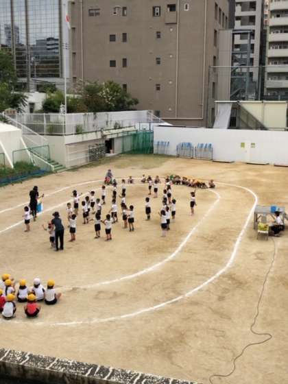 幼稚園の運動会は土曜に実施します。給食の時間に幼稚園のおともだちも元気に練習しています。