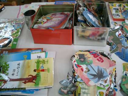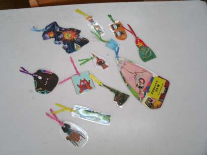 本日の作業は、読書週間中に使う「しおり作り」。しおりの図柄は、不要になった本の カバー。それをラミネート加工して切り抜き、かわいいリボンをつけると世界に一つしかない素敵なしおりが出来上がりました。