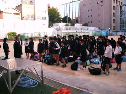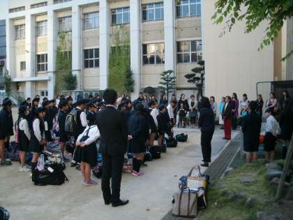 運動場での帰校式では、校長先生や先生方のお話のあと、家族の方や友達と家路につきました。今夜は、どのご家庭でも楽しかった旅行の思い出の土産話に花が咲いていることでしょう。
