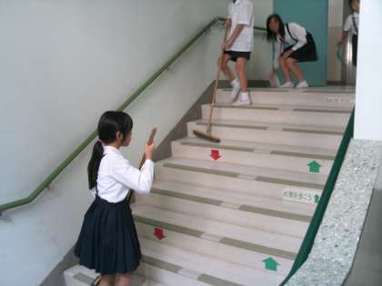 清掃場所は学級ごとに分担が決まっています。東階段を降りると、6年1組の分担場所の階段で5年生の子どもたちが仲良く掃除をしているのに気づきました。