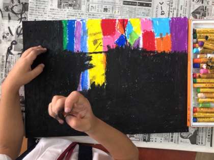 図工では、色とりどりにぬった上からいったん黒色をぬり、尖った物で絵を描くことで幻想的な作品を創っています。