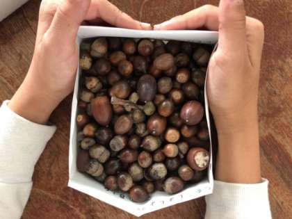 生活では大阪城公園で拾ってきたドングリや落ち葉でおもちゃを創ります。