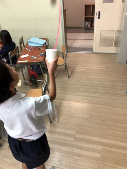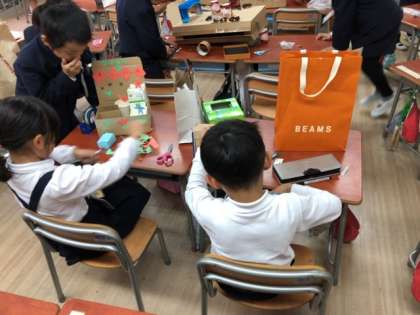 生活では秋見つけで見つけた物を使って、おもちゃ作りをしました。