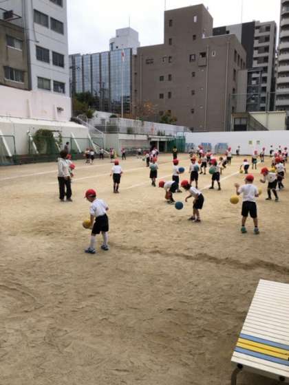 体育では、3分間走とボール運動をしています。