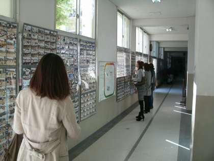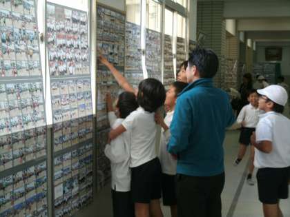 今日の午後は高学年の学習参観・懇談会。次々と来校される保護者の目は、壁にずらりとかかった写真の列にくぎ付けになっていました。その沢山の写真の列は先日行われた運動会。なんとその数4000枚。1階では貼りきれず2階まで写真の列が続きました。その理由は、今年からPTAの補助で、当日は2名のプロカメラマンが違う角度で撮影し、すべてのプログラムシーンを昨年よりも数多く提供できるようにもなったからです。