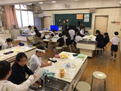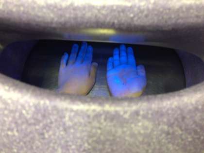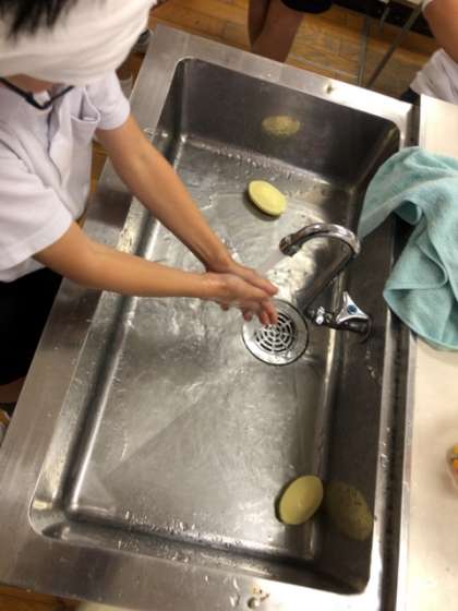保健では、手に見えない汚れがどのくらい付いているのかを特殊な器具で見たあと、手洗いによってどのくらい落ちるのかを体験しました。