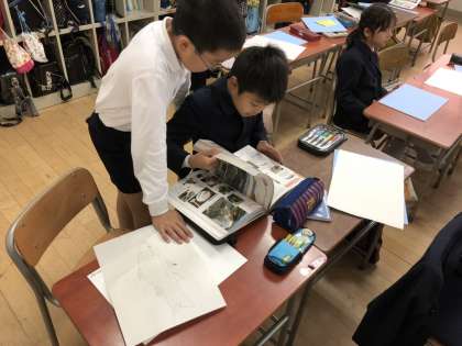 図工は版画の下絵で図鑑を見て魚の絵を描きました。
