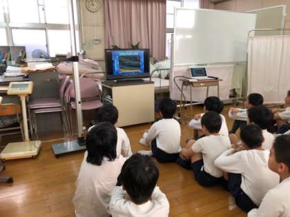 学期はじめの発育測定も実施しています。何センチ伸びたなどの声が聞かれます。測定前にマスクの有効性の授業がありました。