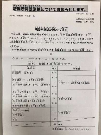 重要なお知らせ 1月18日の避難所開設訓練の一部変更について