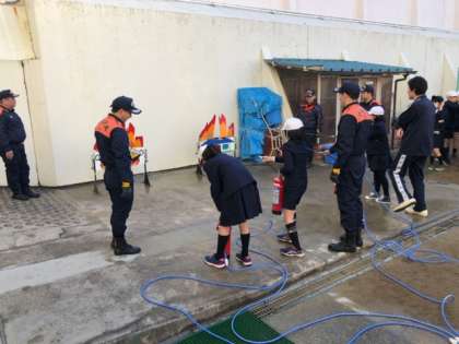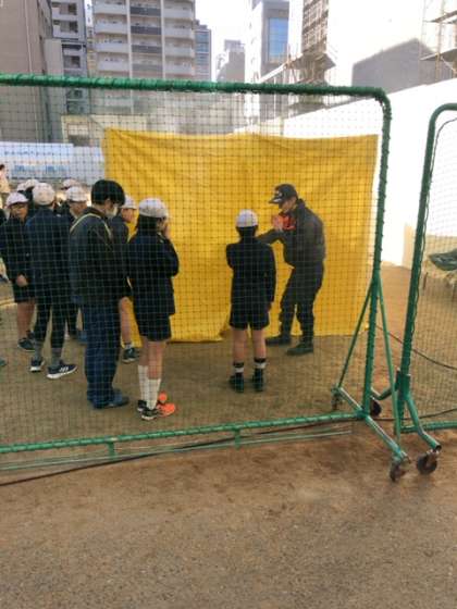 前半の部、5,6年生は防災体験をしました。煙の中を避難する体験、消化器の使い方体験。