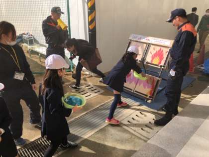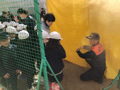 後半の部、3,4年生は防災体験をしました。バケツリレー体験、煙中避難体験。