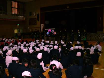今回一番の楽しみは本校の保護者やOBによる読み聞かせボランティア「スマイル」の皆さんが演じるパネルシアターです。実は、スマイルのパネルシアター劇場の知名度は高く、これまでにも市内の学校で土曜授業や各種イベントなどに招かれる機会も多く舞台経験も豊富です。しかし、本校ではまだ一度も全校児童を対象にした発表機会がなかったために、今朝の児童集会の舞台はまさに本邦ならぬ本校初公開の機会となりました。
