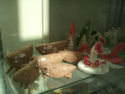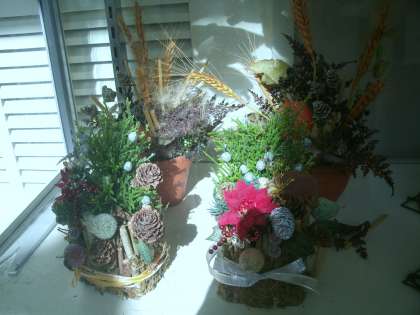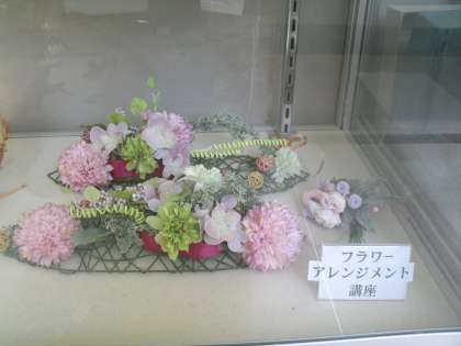 先週の土曜日、家庭科室や会議室を使って、フラワーアレンジメントのクリスマス飾りやフェルトで作る干支人形製作などの講座が開かれました。ご覧の代表作品は職員室横に展示してありますので是非ご覧ください。