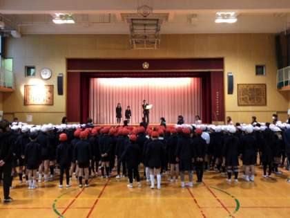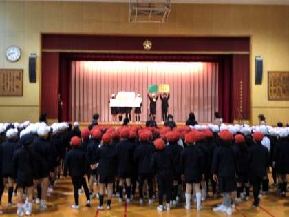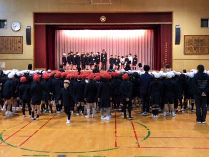 作文や書き初め、バスケットボールチームのキングスへの表彰と、代表委員からあいさつ運動や卒業を祝う会のお知らせがありました。