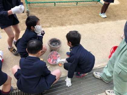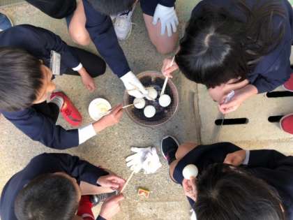 社会は、昔の暮らし体験で、七輪を使い火おこしをし、お餅を焼いて食べました。